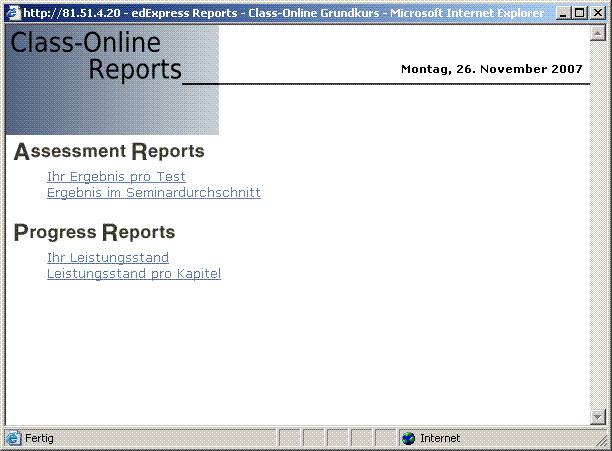 - REPORT System für Teilnehmer und Instruktoren, Reports für Arbeitsfortschritt individuell, für Testergebnisse - individuell und Klassen-Durchschnitt.